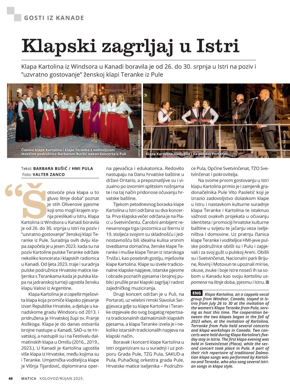 We extend our heartfelt gratitude to the editorial team of Matica and Ms. Barbara Buršić for dedicating space in the August/September issue to Klapa Kartolina’s tour in Istria. It is an honor for us to be featured in a publication that has, for decades, served as a bridge between the homeland and the diaspora.